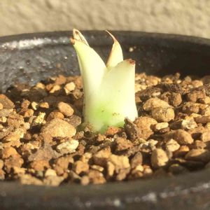 植え替え時に発見した、笹の雪スーパーワイドのカキコ🌱 親株の根元に付いていて、90°で真横を向いて土中で育っていました。100%土中で育ったので、真っ白💧 この子のような葉の短い子たちは、なかなかカキコの状態で土から顔を出せませんよねぇ😓 しっかり根っこも付いていますので、元気に育って欲しいものです😊