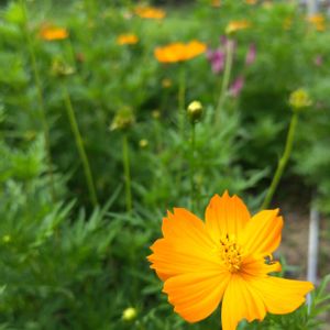 燦々と降り注ぐ太陽の様な 明るいオレンジ色の花 一足先に咲き始めた マリーゴールドよりも背が高く 葉っぱの茂みに浮かんで見える 夏の陽射しのパワーを受けて 元気印の 黄花秋桜🌼