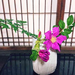 鮮やかな赤紫。 ハッとする美しさ。 茎のとげが鋭く、格闘しながら生けました💦 さすが!バラの原種です。 花とつぼみは下痢止めに。