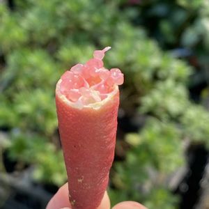 フィンガーライム(リトルルビー) ※オーストラリア原産の柑橘類で、果実の長さ4〜9cmの円筒形、ライムのような酸味があり粒状の果肉とその食感からキャビア・ライムとも呼ばれ果肉は薄いピンク色です。 種類によって果肉の色はグリーン・ピンク・イエロー・レッドなどカラーバリエーションが豊富です。