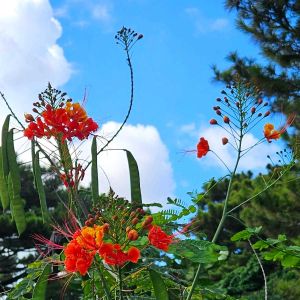 【黄胡蝶】《マメ科》 花言葉 「自分らしく生きるのが一番」 「輝く個性」 「オオゴチョウ=大胡蝶」か 「オウゴチョウ=黄胡蝶」かも 定かではありません 専門家も色々異論があるようです。 薬草としても下剤、発熱剤、痛み止め、咳、呼吸困難、通経剤、魚毒に使うほか、赤い染料としても利用されています 。