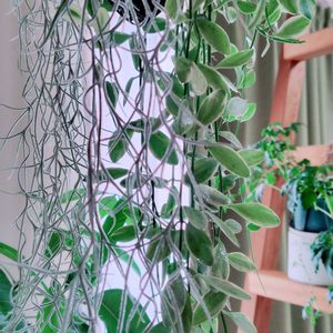 ウスネオイデス♡ もじゃもじゃ〜♪ シルバーグリーンの くるくる葉っぱがꔛ オシャレ〜𓂃 𓈒𓏸𑁍 前から ずーと ず〜と 気になってた子 お迎えしました💕 インテリアとして 壁に吊るしたかったけど。。。 それは蒸れるとかで😅 やめて、、、、 冬まで外管理にしました♪ ②シマトネリコの木に 吊るしてます〜💚 ③このままだと 束ねた部分が蒸れて 茶色く枯れてしまうらしくて ワイヤーで クルクルハンガー ちょっと ぶっ格好ですが〜🤣🙈\\\ 作ってみました♪