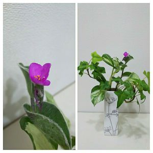 トラディスカンティアシラモンタナ 別名ホワイトベルベットとか白雪姫というそうですね💗もふもふの葉っぱ🥰 いただいて家に持って帰り挿していたらかわいいお花が咲きました🌼