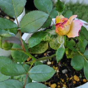 2年前に、瀕死状態だった我が家の薔薇の一枝を、挿し木名人のお隣さんに託したのですが、先日「もうすぐ咲きそうやよ」と言って持って来てくれました🌹 何本か頼んだのですが上手く付いたのは2本だけでした😅ピンク色かな?…と思っていたらイエローっぽいお花が開き始めました💛🩷