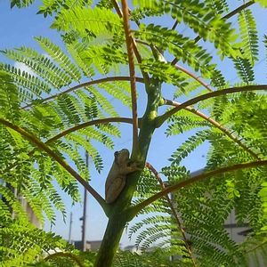 なんか変な感じがするなぁ〜 何かの気配がする イモムシか何かいる⁉️ と思ってキョロキョロしてたら カエル君でした ジャカランダは1回カットしてまたちょっと今年伸びて今2.5mくらいです 花は今年も咲きませんでした💦