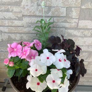 昨日に続き、今日も暑いです。☀️ 夏の寄せ植え。日々草とブルーサルビアとヒューケラ“オプシディアン”🌱 オプシディアンは黒曜石という意味で、黒光りする葉がきれい。日光にも強いみたいです。 中心がピンク色の白い日々草は、昔懐かしい可愛らしさがあって好きです。毎年お迎えする私の夏の定番です。💕