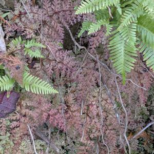 11/8 山でよく出会うシダの仲間では、ウラジロとかベニシダ、トウゴクシダなどがありますが、それよりも葉が丸くて柔らかそうな感じのシダで「ホラシノブ」と言います😊 洞忍と書きますが、シノブに似て洞に生えてそうなという意味ですが、そんなに湿っぽいようなとこが特に好きというシダでもないんですがね… 常緑シダですが、冬になると淡い紫色に紅葉しますが、葉が落ちるわけではありません😅