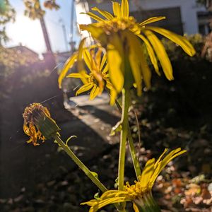 11.17 今朝の石蕗… ①7:30頃先住の石蕗 朝のお陽様 当たりました ②8:00少し前にホタルの葉っぱ お陽様浴びてました ③8;08 ホタルのお花にやっと… 明日からお天気悪い予報… しっかりお陽様に挨拶出来たね〜♡