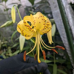 キヒラトユリ 長崎県の平戸島で見つかったコオニユリの黄花変種ですね! オウゴンオニユリに似ていますが、ムカゴが出来ないです。オウゴンオニユリよりもサイズは小さく、茎も細いですね。病気にも弱いので一時期は絶滅一歩手前までいったこともあります😅 我が家では3年連続で開花してくれています😊😊 希少なユリなので大切に育てていきたいです💪💪 たまにキヒラトユリの名前で全く雰囲気の違うユリが販売されている時がありますが、恐らく何らかの他品種との交雑種だと思います😅