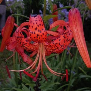 ユリ根(コオニユリ)ちゃんと キキョウちゃんです。 何年前かに、食べずに 埋めたユリ根ちゃん 今年も 咲きました。 隣に キキョウちゃんが、有るので 華やかな色あいです。 連投稿ありがとうございます。