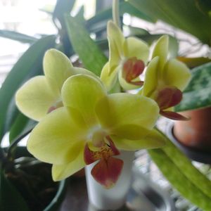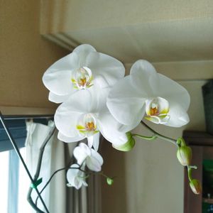 胡蝶蘭咲きました😄 窓辺に置いてしょっちゅう向きを変えているので、花があっちこっちに向いている 写真撮るのも難しい😏