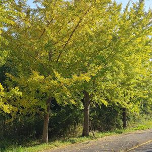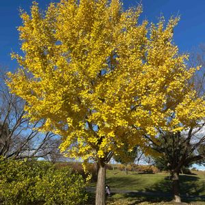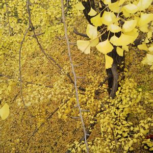 今年も、神社のイチョウ(銀杏)の葉がすっかり黄色くなりました。 イチョウの葉は、もともとカロテノイドという黄色い色素を持っているそうです。 秋になり寒くなると、光合成をしていた葉の緑の成分である葉緑素が分解され、だんだん薄くなり、最終的に葉はカロテノイドの色の黄色になるのだそうです。 ところで、写真左奥のイチョウ、緑色でしょ?同じ神社の境内にありながら、黄色くなるタイミングが毎年かなり遅いんです。不思議です。