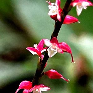 今日のお花❤️ミズヒキ❤️ 水引 タデ科 イヌタデ属 1️⃣秋が深まると、赤色がより一層濃くなって綺麗です❤️ 花が開くものはごく一部で、閉鎖花が多いです 咲き終わった花は閉じて結実します 2️⃣名前の由来 花の上部の半分は赤色❤️下部は白色🤍で紅白に見えます また白い部分が連なっている様と、赤い部分の連なりが水引に似ているという事です 花後は閉じた花(萼)から2裂した雌蕊の柱頭が長く突き出る 蕾の時は出ていない 3️⃣まっすぐ長く伸びています 4️⃣ギンミズヒキ(銀水引) 白花種 5️⃣葉には斑入りのものもあります 人面葉の様です 渓流沿いで ハロウィン🎃っぽくていいですねぇ〜