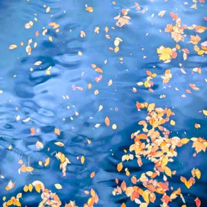 目黒川に浮かぶ落葉が、川面を背景にタペストリーの様な美しさを湛えていました