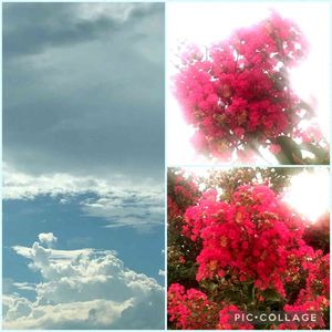 今日の空と雲とサルスベリの花💙☁️❤️ 夕立ち後の空と、サルスベリの花も逆光で偶然キラキラ✨✨してましたよ😊 明日も不安定な天気が続きますが 皆さまご自愛くださいませ🙇♀️♡