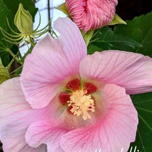 「午後 近所の池にて」No3 フヨウ(和名) 朝咲いた花が 夕方には萎む 大きくて 綺麗な花です ワンカットで ツボミ・明日咲く花 ?・大輪の花