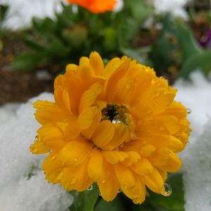 花壇のキンセンカ💛🧡 午前中降り続いた雪が雨になりました☔️ 水っぽい雪です❄️ プランターは全て軒下へ移動しましたが 地植えの子たちは雪をかぶって寒そう🥶 どうか萎れないで~🙏💦