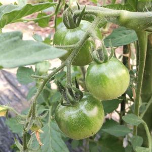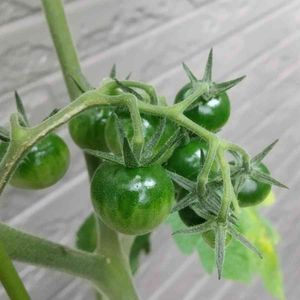 ミニトマト(つやぷるん)が大きくなってきました🍅名前のとおり?すでにつやつや光っています✨赤くなるのはもうしばらくかかりそうです