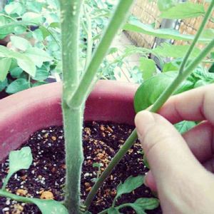 我が家のトマトです!9号プランターでバジルと一緒に育てています。今は第3花房まで実がなり、第5花房まで蕾がついています。 質問なのですが、 ①写真で掴んでいる茎が、購入したときはなかったのですが、土の中から出てきました!切ってしまった方が良いのでしょうか? ②また、水の吸い上げが悪いのか、根元の茎から根っこも沢山出て来ています。そして真ん中より下の方の葉が少し黄色くなってしまいました!これは先日、天気の良い日に12時間程外出していて帰ってから急いで水をあげたのですが、それが変色の原因かなと思っています。けれど、茎から出ている根っこは結構前から出ています。実は普通になっていますが、葉が黄色くなってから、上の方の葉のみ、しなしなで柔らかく、くるんと丸まっていて明らかに元気がありません。真ん中の葉は弓なりの形ですが、黄色い葉っぱの所は少ししなしなです。 黄色い葉っぱは、切ってしまわず、このままの方が良いのでしょうか? また、水はけの良い土に植え替えした方が良いのでしょうか? どなたか詳しい方、教えていただけると助かります!宜しくお願いします!!