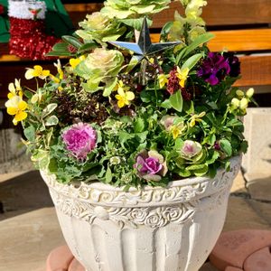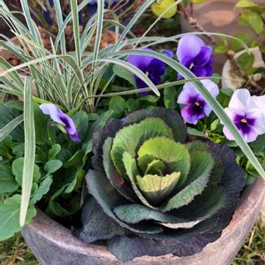 こんなん作ってみました〜🤗 No.20 去年の寄せ植えで使い 解体後は お1人様鉢で夏越しさせた "スキミア" ・踊り葉牡丹 高性 ・フリル葉牡丹 ピーチレディー ・ミニ葉牡丹 プラチナケール 葉牡丹3種をメインに作りました😆 高低差・正面右左ムズかった🤯 我が家にある1番大きな鉢なので 自己満足指数… 🤔んんん…90点 甘甘だね〜🤣🤣🤣 Φ37cmXH29cm FRP鉢