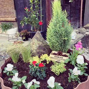 🎄 円形花壇のリニューアル クリスマスバージョン 🎄 おはようございます☀ 6月に仕立てたサンパラソルと ペンタスの円形花壇 長い期間楽しませてもらいましたが 花も終わりに近づいて来ました それでクリスマスバージョンに リニューアルしました 昨年の寄せ植えに使った後 育てた ゴールドクレスト ウィルマ🎄を シンボルツリーにして岩を置き🪨 カレックス アマゾン セダム ミモザ で原風景を演出♪ 真っ赤なミニ薔薇🌺の周りには ピンクのストック オキザリス ローズを置き 白いビオラで雪を感じさせるような 花壇にしてみました🎶 これから少しずつ手を加え 仕上げていきたいと思います😁