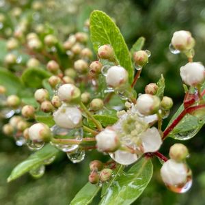 あと少しで雨が上がりそうです ピラカンサに雨粒が! 美しい涙をいっぱいためてます💙