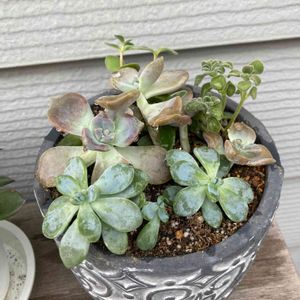 やっとほしい鉢が手に入った! 土曜日まで待ちきれず寄せ植え作ってしまった。満足❣️ ローラは遂にチョンパ😅クラウドとその子供達は葉挿しと増殖した子株たち。 ツル系はお友達がくれたもの💕