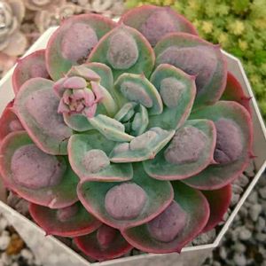 こんばんは(*´ω`*) 午後から晴れ間が見えて気温も25℃と過ごしやすい1日でした😌 車は灰混じりの雨で白いマダラ模様だけど今日は黄砂が飛ぶらしかったので洗車は我慢😥 ダブルパンチだわ⤵️ 本日は ライラックスノー 親株にハートをワシづかみされp的にはお高かったけどポチった子 届いた時に1円玉ほどしかなく育つかハラハラしてたけど1年以上経ってやっとこの大きさ😅 親に少し似てきて嬉しい🎵 二度と出会えない気がするので大切にしてる子です😊