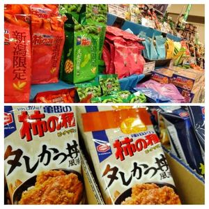 お盆なると並ぶ新潟土産。 柿の種コーナーが出来ていました。 期間限定の変わり種も多いですね😅