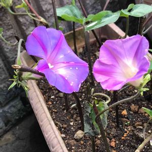 こんにちは😊 今月9日にフラワーさんから頂いて挿し木してた琉球朝顔の花が咲きました╰(*´︶`*)╯♡ 寄り添って二輪💜💜
