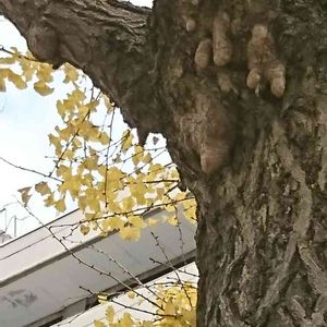 乳銀杏 気根が出ている銀杏の品種 乳房の形に似ているところから、「乳銀杏」の名で親しまれています 「子供の健やかな成長を願い、幹から下がっている乳柱を削り、煎じて飲むと母乳が良く出ると言い伝えられ、昔から母乳や安産の 神木として信仰を集めている銀杏の老木 この銀杏の木が山下公園前の銀杏並木にあるとは😵‼️