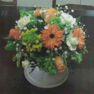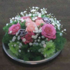 ドーム(ラウンド) 形 半円形型 360°展開(四方見) 用途 テーブルデコレーションによく使われる事が多い。 花器 基本としては、安定感のある低い花器。 飾る場所によって、高い花器にすることもある。 ex 立食のパーティー 目線が高いので 使いやすい花材 どんな物でもOK ex グリーンのみ ハーブのみ 花材 バラ ガーベラ spカーネーション ストック ラクスパー かすみ草 レザーファン ナタネ