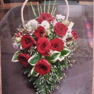 バスケットブーケ (フリースタイル) 形 藤カゴなどのバスケットに入った、ブーケスタイル 用途 ミモレ丈の可憐なドレスやコットン素材のカジュアルなドレスに似合う カゴの柄を両手に持ってさげても、片腕にかけてもよい。 花婿さんが摘んだ花をプレゼントするという、ブーケ本来の意味を、野の花をこんもり盛ったようにアレンジする事で、忠実に再現できる。 作り方 (1)バスケットにスポンジをセットし、フリースタイルでアレンジする。 (2)花婿の身体に沿う側を除き、バスケットから遊びの花をとばす。 (3)持ち手の部分にリボンを巻いて仕上げる。 ポイント 持った時にバスケットがぐらつかない様に花の量、長さを左右均等になるように挿す。 挿し直しはしないように。花材 バラ spバラ spカーネーション ガーベラ かすみ草 レザーファン ミリオン