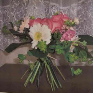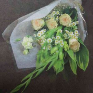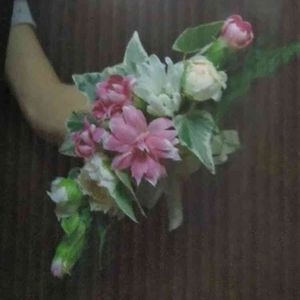 クレッセントコサージュ 形状 三日月形 用途 曲線ものなので、女性のコサージュ向き 作り方 (1)花材をカットし用意する。 机上で形を作りながらカットしていくと、花材量の目安がわかる。 (2)ワイヤリング (3)テーピング (4)パーツ作り FPの中心部分と上下の部分の3つのパーツを作る。 合体させた時のつながりが出る様に組み合わせに気おつける。 (5)パーツの合体 (6)ハンドル部分をフローラルテープで巻き付け、リボンで隠し飾り用のリボンをつける。 花材 spバラ spマム spカーネーション アイビー アスパラ