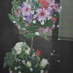 トピアリー 作り方 (1)テラコッタにオアシス、アクアボールに枝をセットする。 (2)オアシスにアクアボールの付いた枝をさし立てる。 (3)オアシス、アクアボールをグリーン(ミリオンなど)で隠す。 (4)花でアレンジしていく。 SPバラ SPカーネーション SPマム かすみ草 ミリオン アイビー ラクスパー