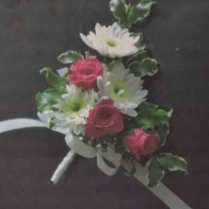 リストレット 形状 手首に飾るコサージ クレッセントやホガース状にまとめ、リストレットバンドや土台に止めつけるもの リング状のもの 用途 ダンスパーティー用 花材 小さめの花(小型のランやバラ等) 作り方 (1)#24のワイヤーにテープを巻き、先端を丸めて輪を作る。 (2)輪を作った下から順に花をランダムに配置し、花首を出来るだけ短くしながら隙間ができない様に密にして、ガーランド(花網)を作る。 (3)手首に合わせて丸め(1)の輪に最後のワイヤーを通し止める。 (4)形を整え仕上げる。 花材 spバラ spカーネーション spマム かすみ草 アイビー ミリオン