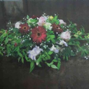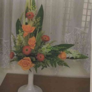 オーバル 形 楕円形 180°展開 用途 部屋のコーナー。 窓際に置くアレンジ。 豪華で優雅な雰囲気。 花器 高めの安定のある花器 FPを中心に上下に展開するアレンジのためオアシスを高めにセットする。 使いやすい花材 どんな花材でもOK ポイント 豪華なイメージを作りやすいので、FPにはマスフラワー(バラ、ガーベラ、カーネーション等) トップと下部には先に広がりのあるもの (開花したバラ、キクなど)を使うとよい。 花材 バラ ガーベラ spカーネーション かすみ草 レザーファン