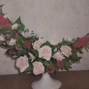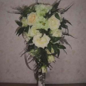 キャスケードブーケ (ワイヤー) 形 滝が流れ落ちる形 ラウンド➕ガーランドで 二等辺三角形 作り方 (1)花材をカットし準備する。(本番用ではコットンもあるとよい。) (2)ワイヤリンド (3)テーピング (4)基本となる花で、ベースを作る。 上の部分のラウンド。 下の部分のガーランド。 (5)残りの花材で、上部のラウンドと、下部のガーランドが、繋がるように埋めていく。 (6)ハンドルの部分を、フローラルテープで巻き付け、リボンを巻き、飾りリボンも付ける。 ガーランドは下から上へと組んでいく。 横から見たとき、平らにならないように。 花材 バラ アバランチェ トルコキキョウ レザーファン アスパラ ルスカス