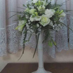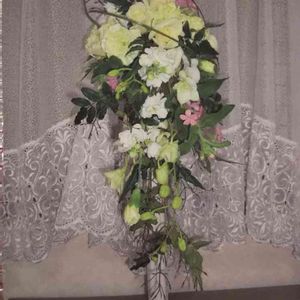 キャスケードブーケ(ブラィディ) 形 懸垂形 キャスケードとは「小さな滝」という意味 ラウンドブーケにガーランド(花網)を組み合わせるという、円形と二等辺三角形の組み合わせが基本 ガーランドとは複数の花や葉を長く繋ぐこと、繋いだもの。 用途 ウエディングブーケ 上品でノーブルなイメージのドレス向き トレーンを長く引くドレスや前身ごろがシンプルな正統派ドレス向き 作り方 (1)FPを挿しアウトラインをお花やグリーンで作る。 (2)ガーランド部分の下部から段々花材を挿していく。 (3)ラウンド部分とのバランスを考え全体にお花やグリーンを挿す。 (4)ヒィラフラワーも全体的に挿していく。 花材 バラ spカーネーション spストック デンファレ レザーファン ハゴロモジャスミン ベアグラス ピンクスター
