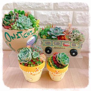 ♡♡♡オーダー品♡♡♡ そろそろ多肉達の色も落ちてきたけど それでもやっぱり可愛い❤️ からし色の鬼っち達の名前は『芥子丸』 後ろの鬼っちバスはタイヤが旧タイプのもので今はもうリニューアルしてます💛
