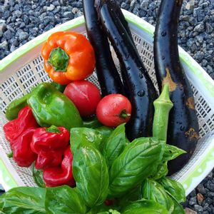 みどりのまとめで公開中の、ナスとカラーピーマン、麻婆茄子にして美味しくいただきました。 ミニトマトはサラダに…。 カラーピーマンは赤色に変わる前のオレンジですが、甘みもあって美味しかった👍