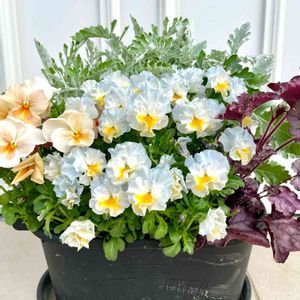 【 ビオラ・ユーカリ・白妙菊・シェリエメール 】 ビオラの背が伸びて、大きな寄せ植えになっています🎵花摘みをしながらメンテナンスしていますが、追いつきません😅 子どもが学校に行った月曜日の朝はのんびりできます😊