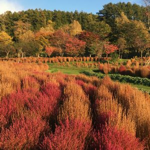コキアの丘♪♪♪ 緑の芝生と真っ赤なコキア! 夕日のオレンジも混ざって鮮やかな光景でした✨ (Instagramにて他pic投稿中!)