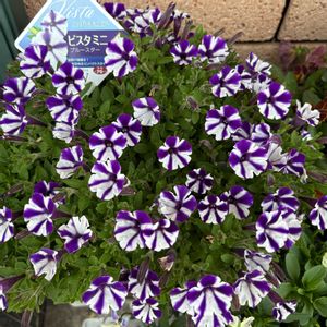 PWさんのスーパーチュニアビスタミニブルースター ふむーあいかわらず長いんだよねー名前 タグ外れたら一気に名前分からなくなるヤツー 坊主刈りから回復中(´・_・`) ミニなだけあって花柄摘み大変😵