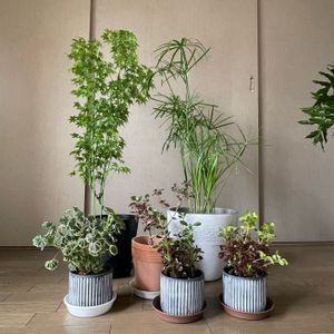 昨日植替えをしたベランダ組です。 1-紅葉 2-シュロガヤツリ 3-コプロスマ 2種 赤とチョコ 4-名前不明の木 5-ゼラニウム 素焼き鉢に植替えた🪴名前不明の木は、 花でも咲いてくれないと分からないなぁ。 大物の植替えは体力が要りました〜🤣