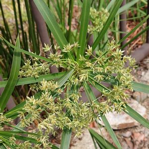 庭の池の中で育てているシュロガヤツリ🌿 小さなお花が咲いてます🎉 こんな形の葉っぱ🍃好きです❤ (2021/5pic)