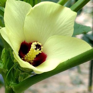 今日のお花、オクラ❗ 家庭菜園のオクラ💛🤎💛 今年はうまく育ちません🤣 ヤット花が…😅 ミニトマトは豊作❤️