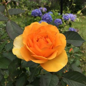 おはようございます😃 ニーナちゃん(仮名)今朝はこんだけ咲いてました。なかなか開くのにも時間のかかる子です。 向こうのアジサイさんとのコントラストが綺麗です。🥰 これはどうみてもオレンジ色ですよね? ベージュではもう咲かないのだろうか?🤔🧡