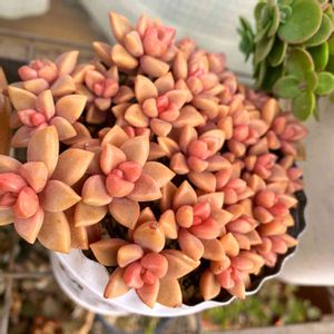 葉挿しを鉢いっぱいに並べて育てたブロンズ姫丼。 なかなか大きくならないけど、サーモンピンクでもりもりしてて可愛いです🧡