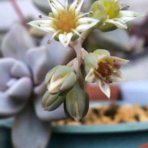 淡雪 (グラプトペタルム属) お花が咲きました~⸜(*ˊᗜˋ*)⸝ 朧月とアメジスチヌムの交配種だそうです😊 葉っぱは、朧月感が強いけど、白いお粉を纏って、丸みを帯びているかな~😙 朝晩、ヒンヤリしますね💦 体調崩さない様に気をつけましょう٩(◦ˆ꒳ˆ◦)۶